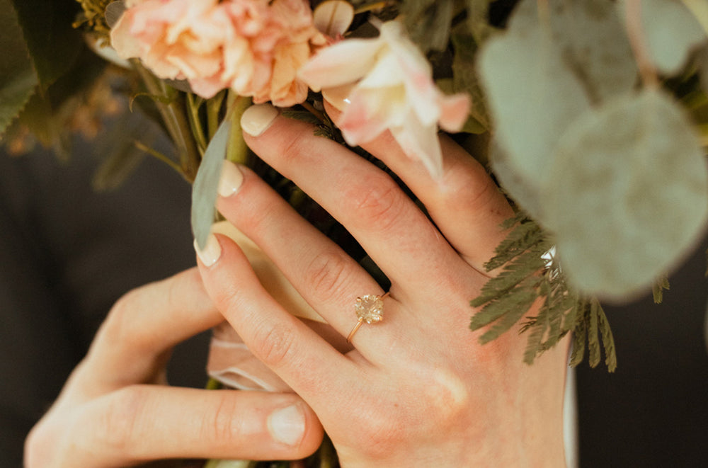 "At first glance, my Natalie Marie engagement ring appears delicately minimal. But there is a subtle beauty inside the rutilated quartz that is as complex, unique, and imperfectly perfect as love itself. In certain moments its beauty is quiet and humble. While in others, illuminated by sunlight, it shouts its radiance with a golden glimmer. This play between intricacy and simplicity reminds me every day that our love is both. Easy and hard, simple and complex, quiet and radiant, and ever evolving." - Amanda
