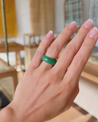Carved from rich green jade, each ring carries its own natural marbling - a landscape shaped over time, entirely unique. Smooth and grounding against the skin, its rounded silhouette feels both substantial and serene, a gentle reminder of the cycles we move through and the steadiness that lives within them.